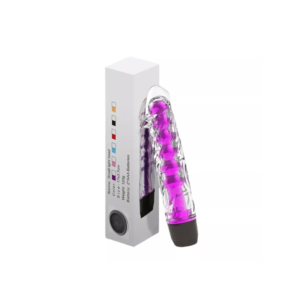 Den medfølgende dildoen har en fleksibel, gjennomsiktig geléhylse med myk tekstur kombinert med en fast indre kjerne for stabilitet. Den er designet for realistisk følelse og målrettet stimulering, og har justerbar vibrasjonsintensitet via vrikontroll i bunnen.