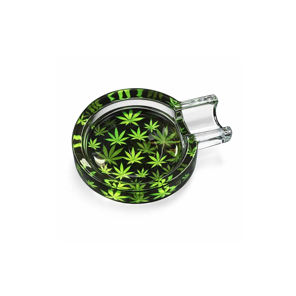 Dette runde askebegeret i glass med 420 Jungle Black Leaf-design har en mørk og kraftfull stil med sort bakgrunn og flere grønne cannabisblader. Kontrasten mellom det sorte glasset og de grønne bladene gir et moderne og markant uttrykk.