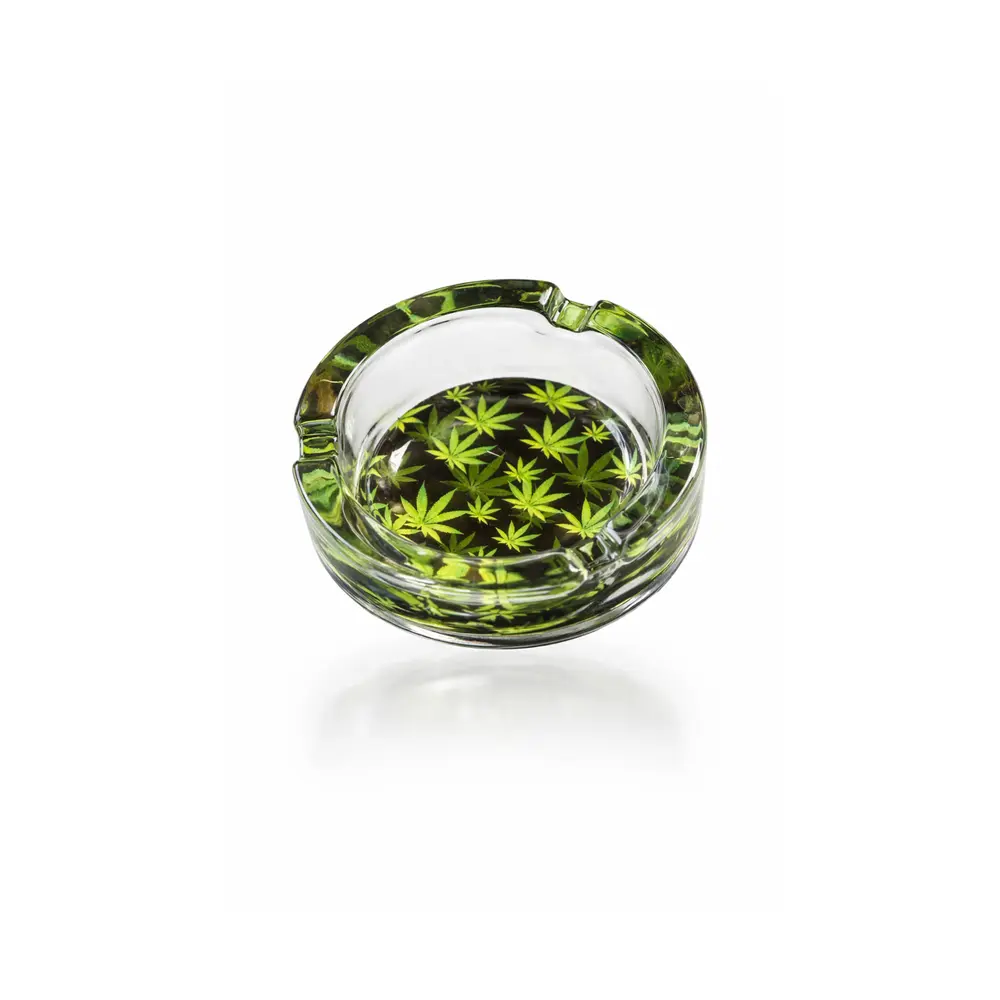 Stilrent og solid askebeger i glass med dekorativt grønt bladmønster. Dette askebegeret kombinerer funksjonalitet og design, og passer perfekt både innendørs og utendørs.