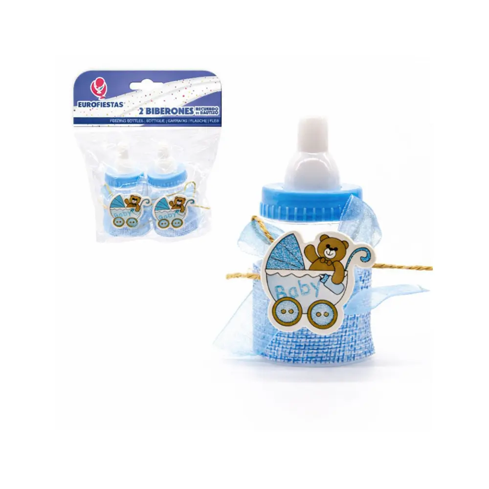 Disse dekorative babyflaskene i blått er perfekte til baby shower, dåp, navnefest eller velkomstfeiring for en liten gutt. Flaskene er pyntet med blå sløyfe, tau-detaljer og et søtt motiv av bjørn i barnevogn med teksten «Baby».