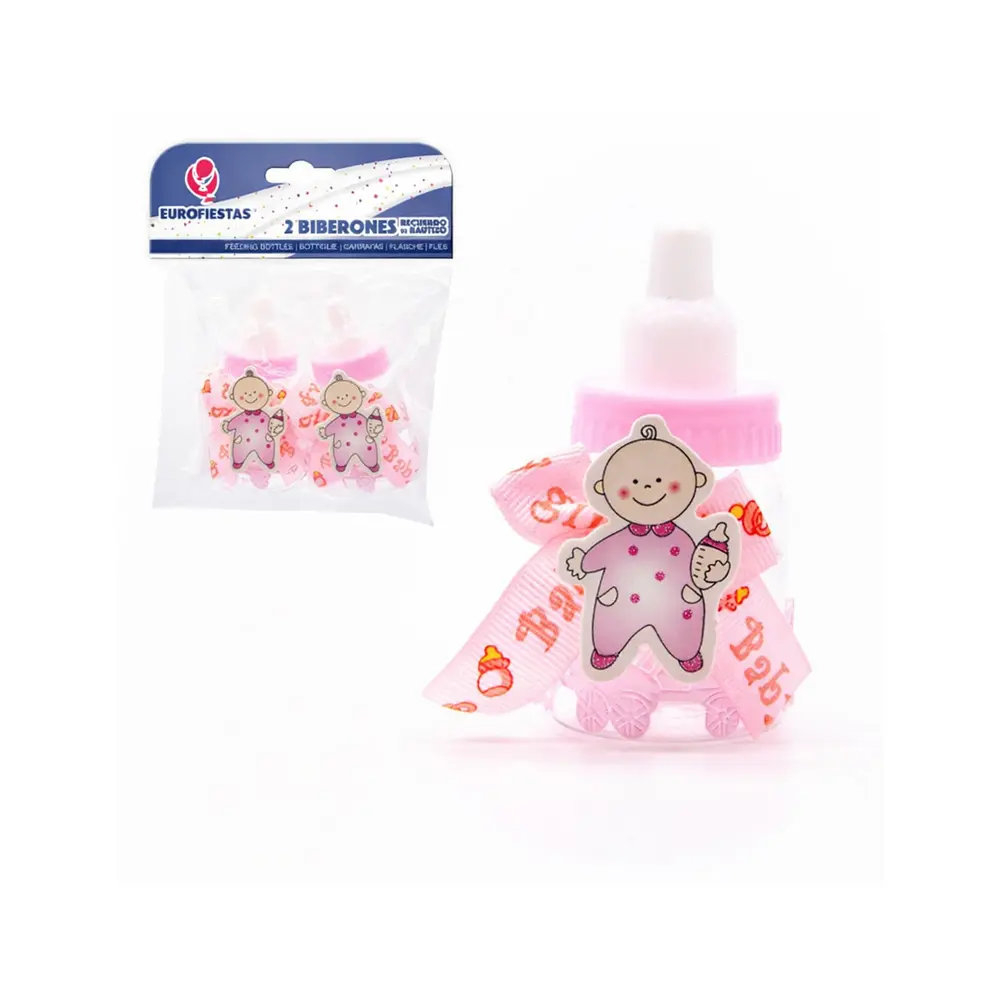 Disse dekorative babyflaskene i rosa er perfekte til baby shower, dåp, navnefest eller velkomstfeiring for en liten jente. Flaskene er pyntet med rosa sløyfe, tau-detaljer og et søtt motiv av baby med flaske.