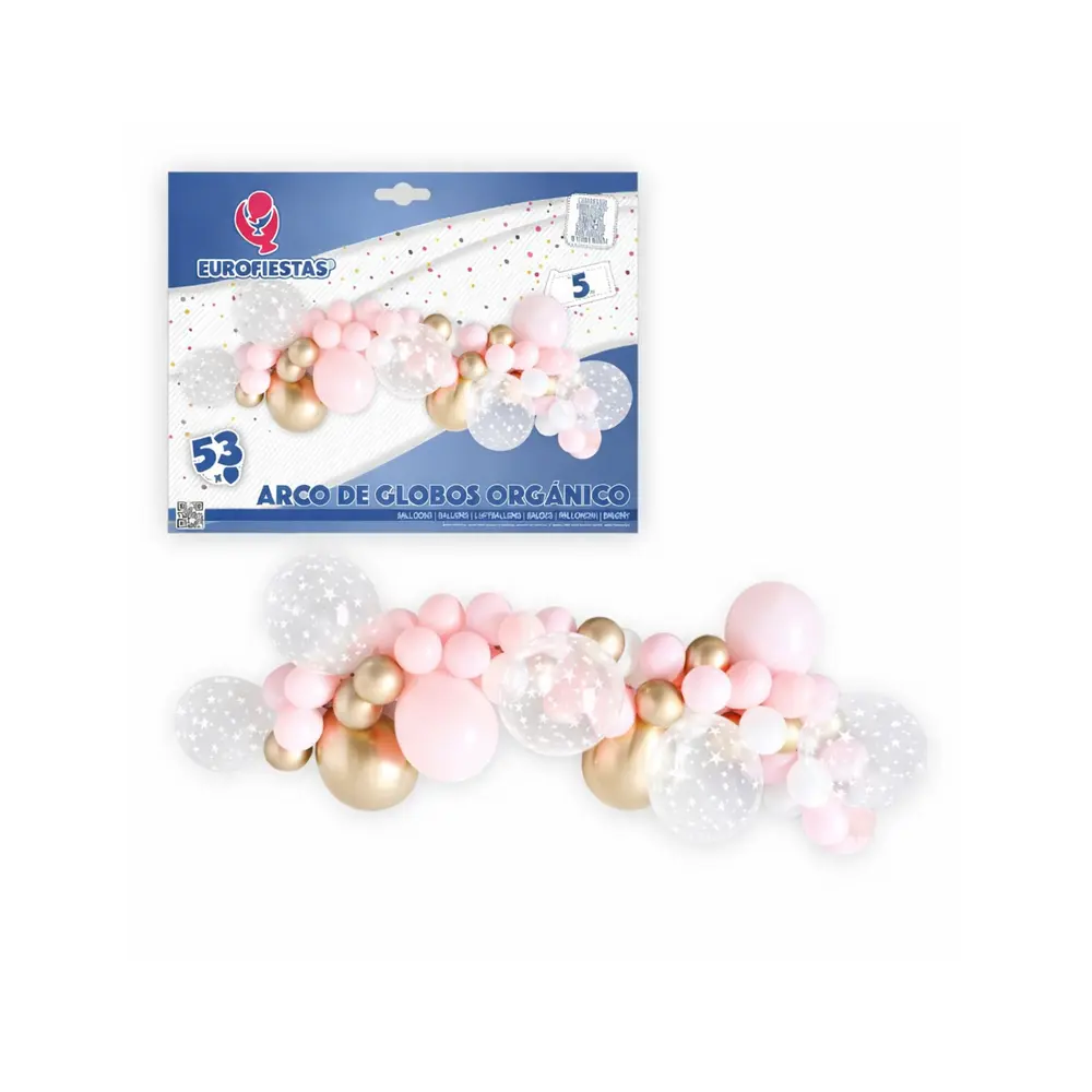Ballongbuen måler hele 5 meter og inneholder totalt 53 ballonger i matchende rosa og gullfarger som gir et eksklusivt og dekorativt uttrykk. Den passer utmerket over inngangspartier, dessertbord, gavebord eller som bakgrunn til bilder.