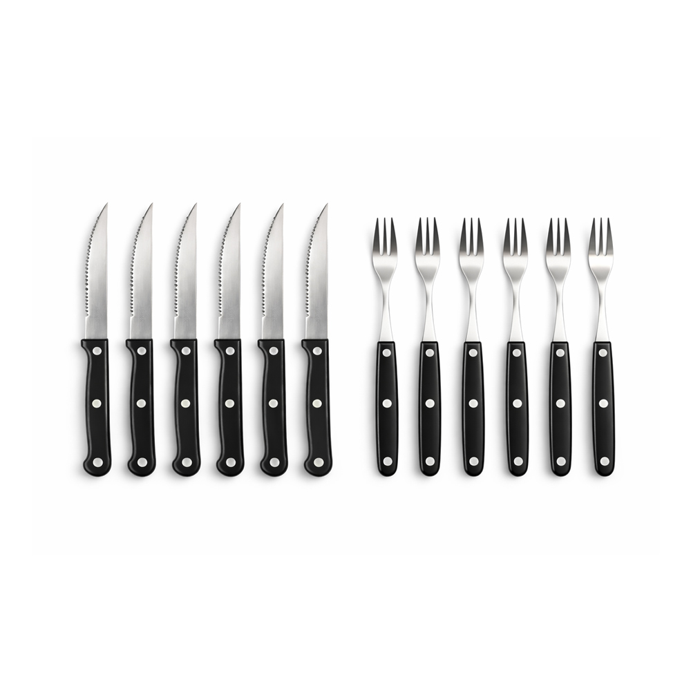 Komplett biffkniv- og gaffelsett i 12 deler – perfekt til grillkvelder, BBQ, biffmiddager og hyggelige sammenkomster. Settet inneholder 6 skarpe biffkniver og 6 matchende gafler som gjør det enkelt å skjære gjennom saftige kjøttstykker.