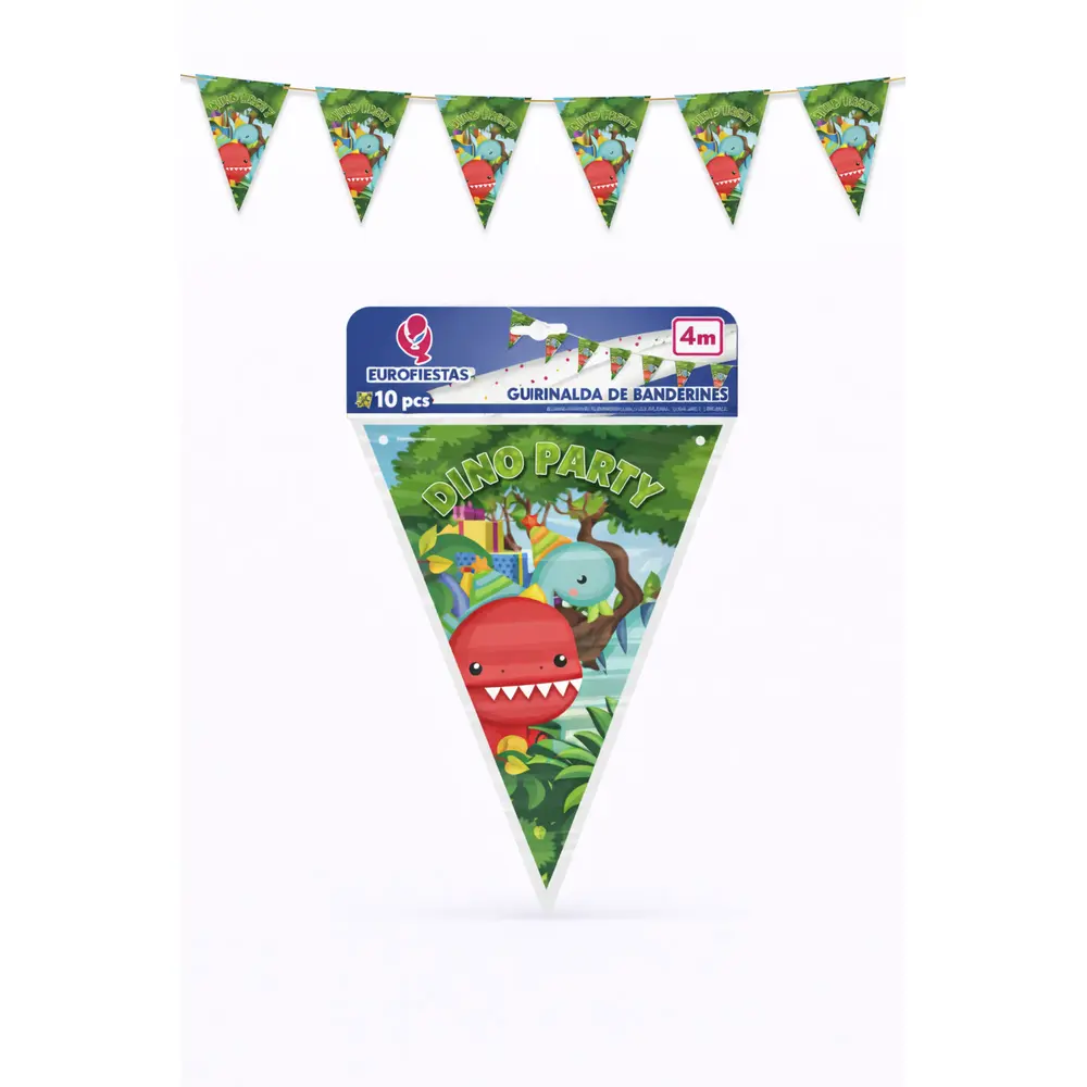 Gjør bursdagen ekstra spennende med denne fargerike Dino Party banner/girlanderen. Banneret består av 10 trekantede flagg med morsomt dinosaurmotiv og teksten «Dino Party». Perfekt til barnebursdag, temafest eller enhver feiring for små dinosaurfans.