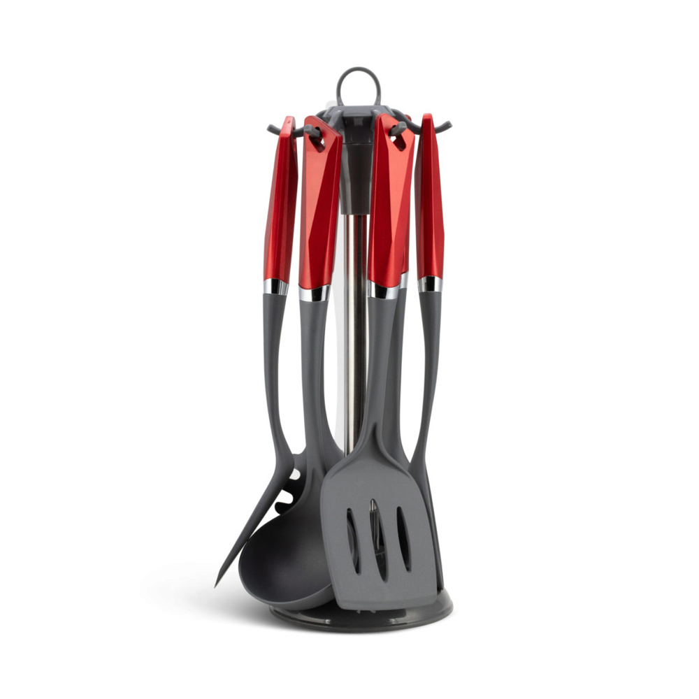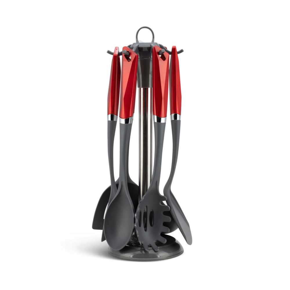 Det roterende stativet gjør det enkelt å få oversikt og rask tilgang til riktig redskap, samtidig som kjøkkenbenken holdes ryddig. Settet er lett å rengjøre og passer godt både til hverdagsbruk og til mer omfattende matlaging.