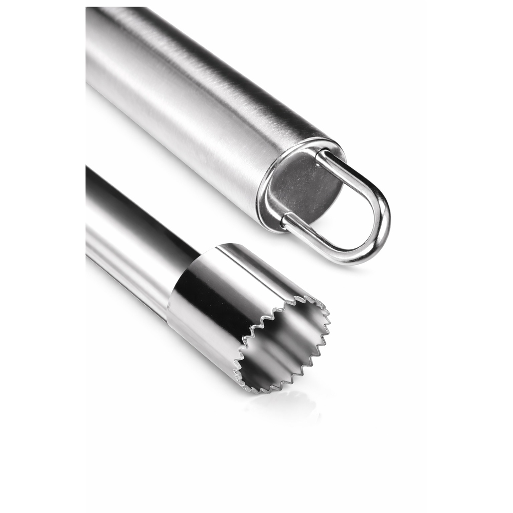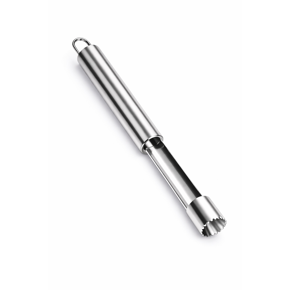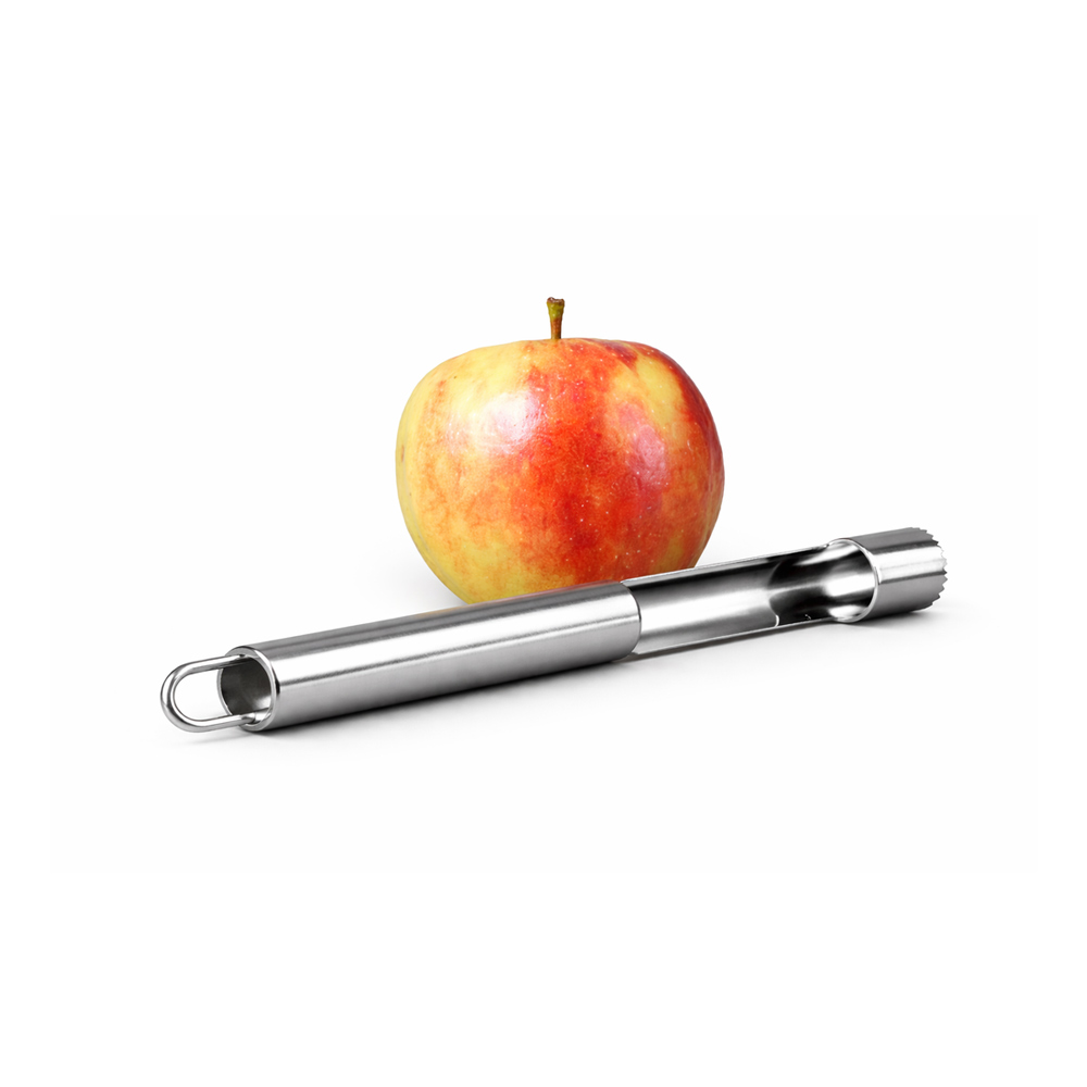 De taggete spissene skjærer enkelt gjennom frukten og gir en ren og presis utskjæring av kjernen. Bare trykk ned, vri lett og trekk ut – så er eplet klart til bruk.