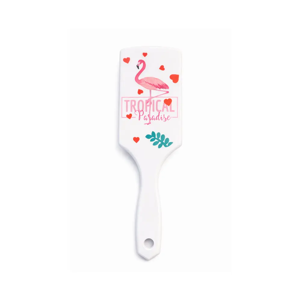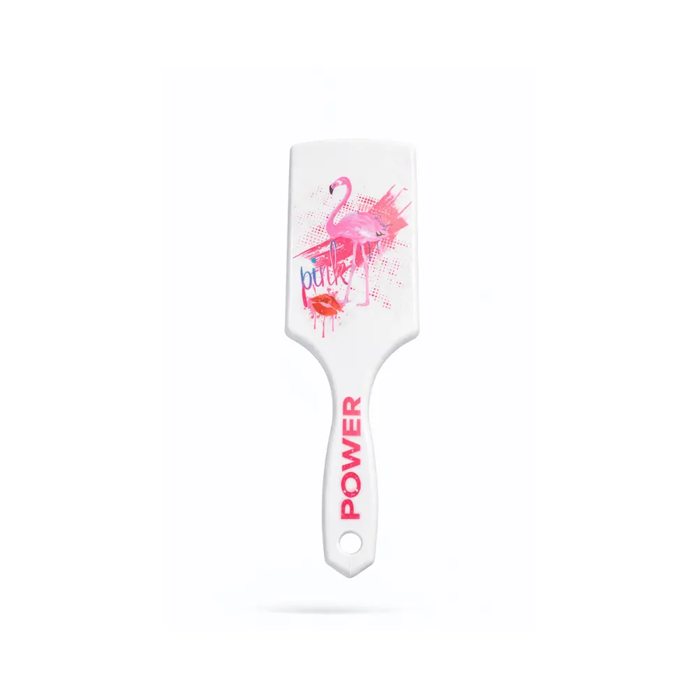Denne dekorative hårbørsten med flamingo-motiv kombinerer funksjonalitet med et fargerikt og moderne design. Børsten er utstyrt med fleksible pigger med avrundede tupper som glir lett gjennom håret og bidrar til en behagelig hårbørsting uten å lugge.