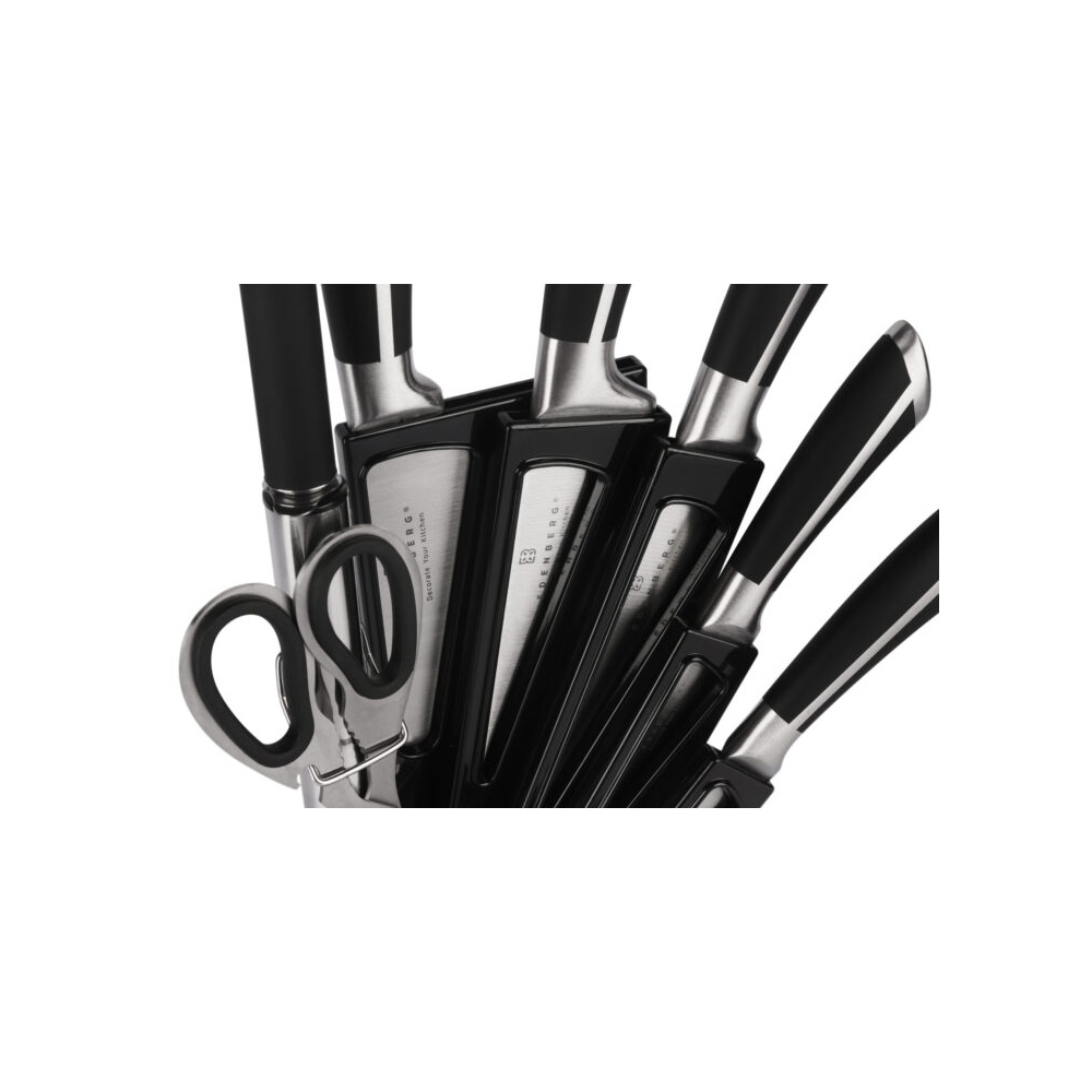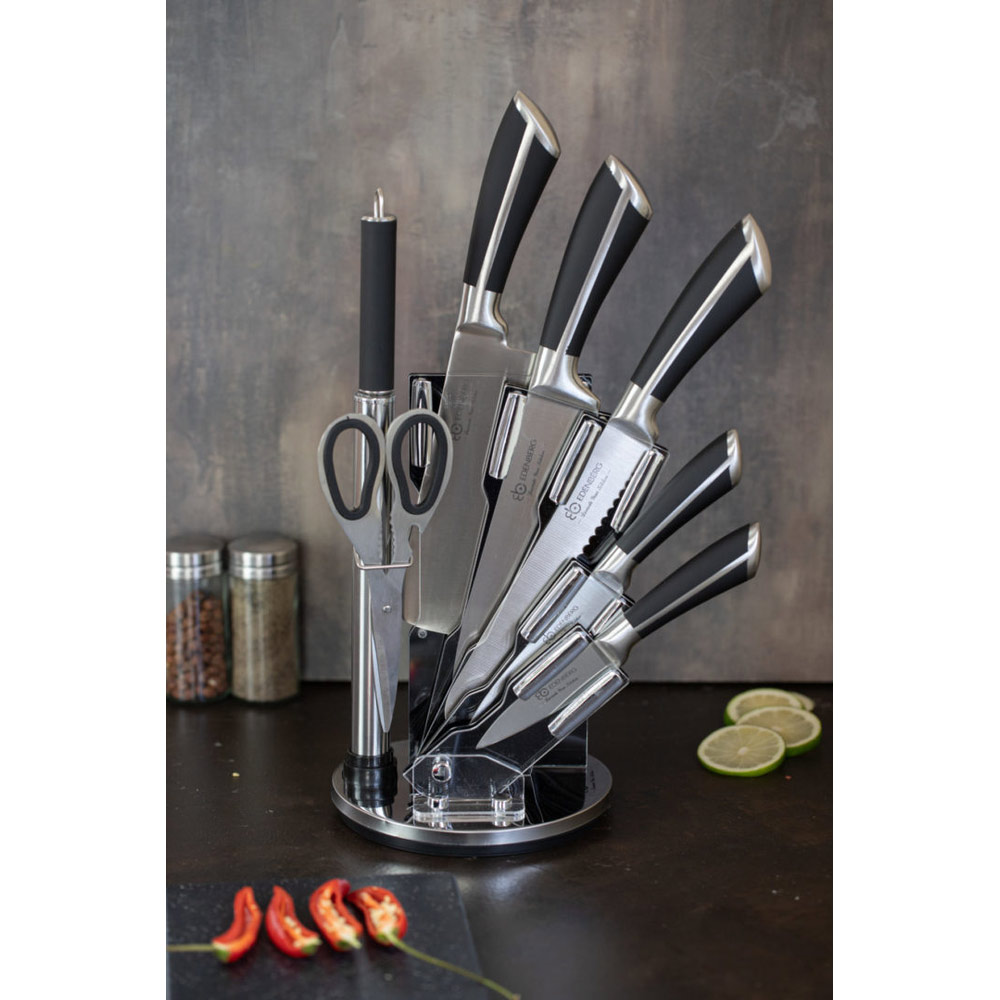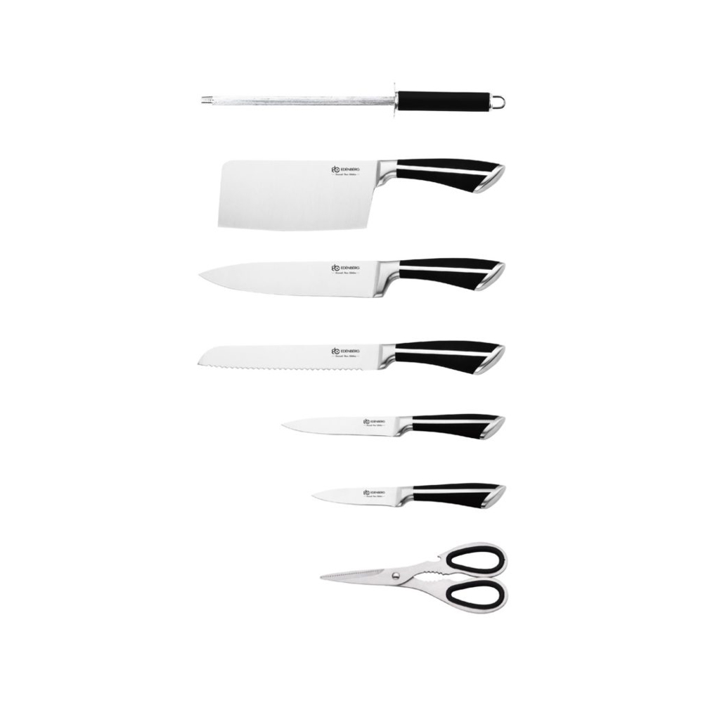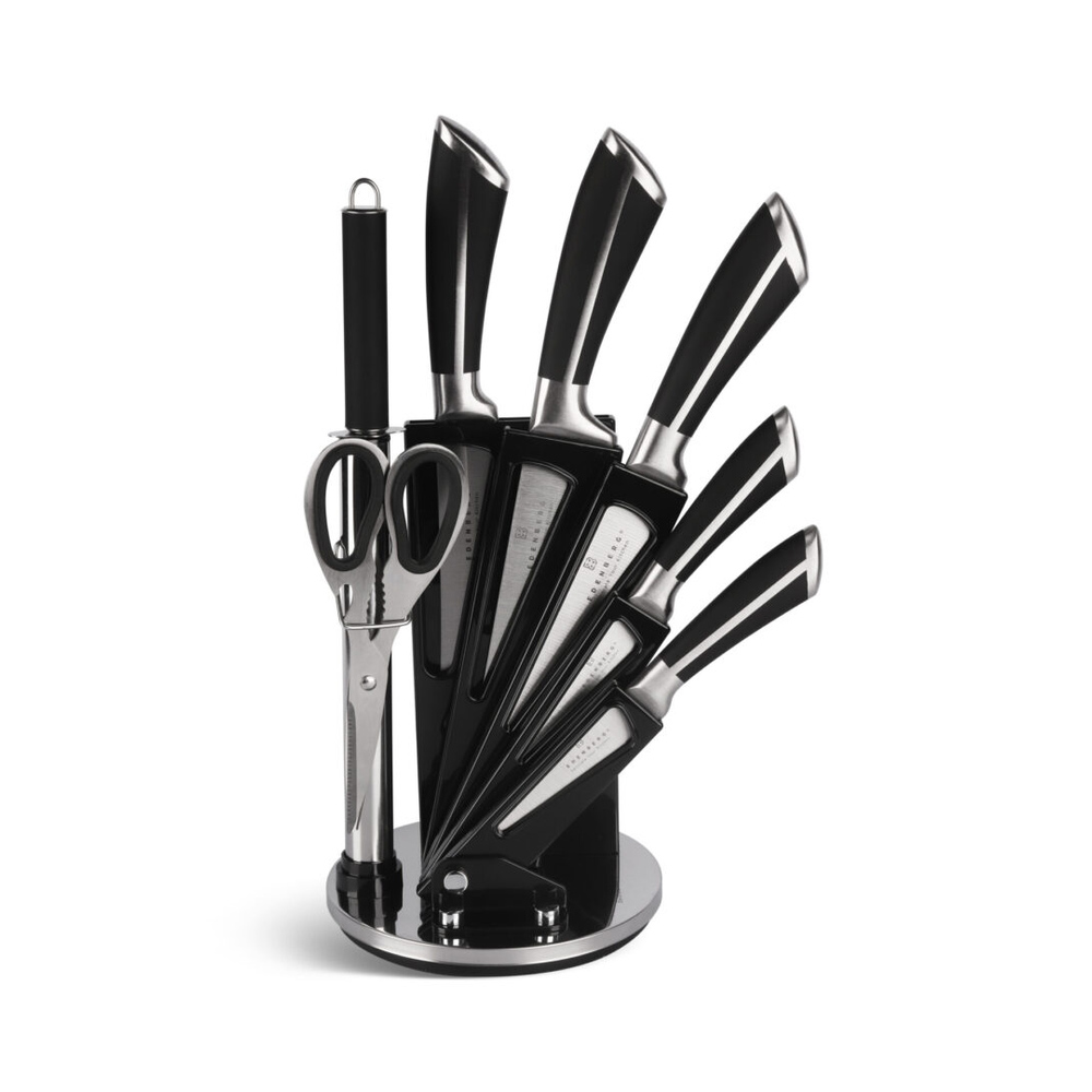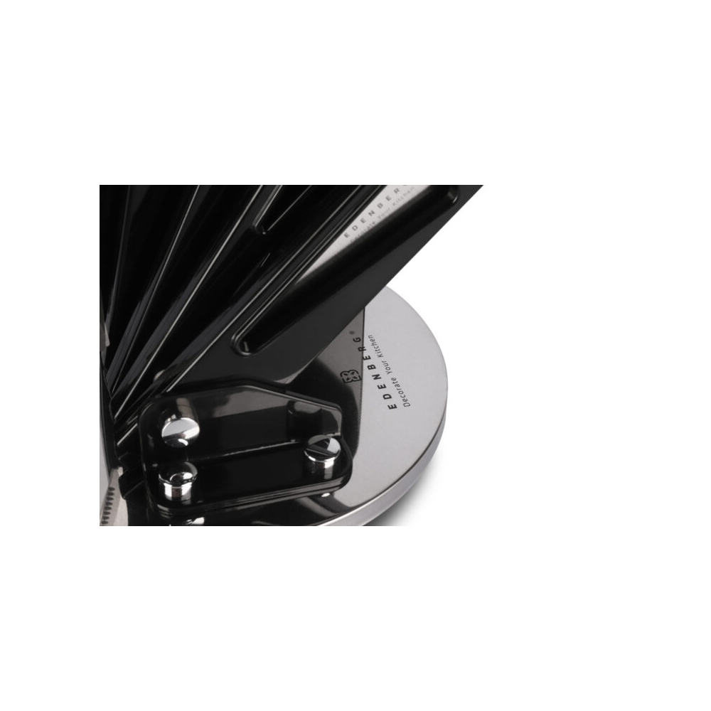 Dette komplette knivsettet fra edenberg med 8 deler gir deg de viktigste knivene og tilbehøret samlet i ett stilrent, roterende stativ. Knivene er laget av karbonstål i ett stykke, noe som gir god balanse, presisjon og lang levetid.