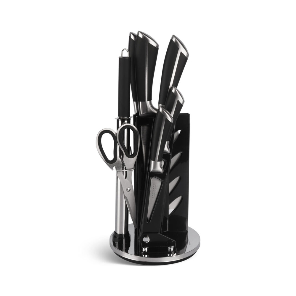 Komplett knivsett i karbonstål med 8 deler og roterende stativ. Ergonomiske håndtak og solide kniver som dekker de fleste behov på kjøkkenet.
