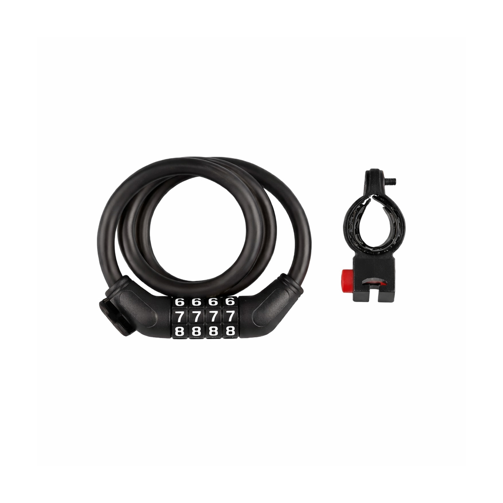 Praktisk sykkellås med personlig femsifret kode. Fleksibel vaier på 1 meter gjør den enkel å bruke til sykkel, barnevogn eller moped. Leveres med feste til sykkelramme.
