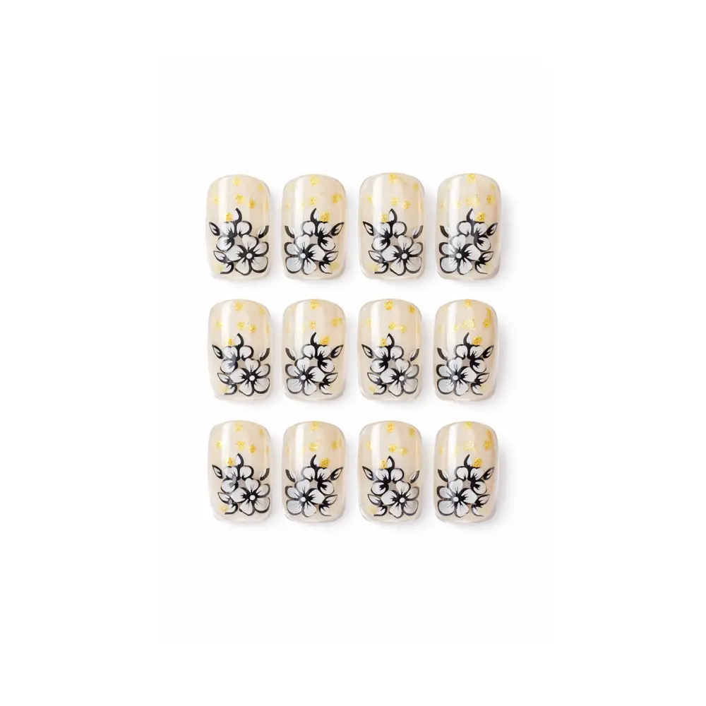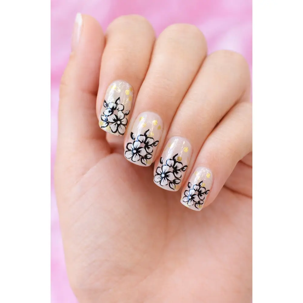 Dette vakre settet med løse negler gir deg stilige og velstelte negler på få minutter. Neglene har et elegant blomstermotiv kombinert med små gull-detaljer, som gir et dekorativt og feminint uttrykk.
