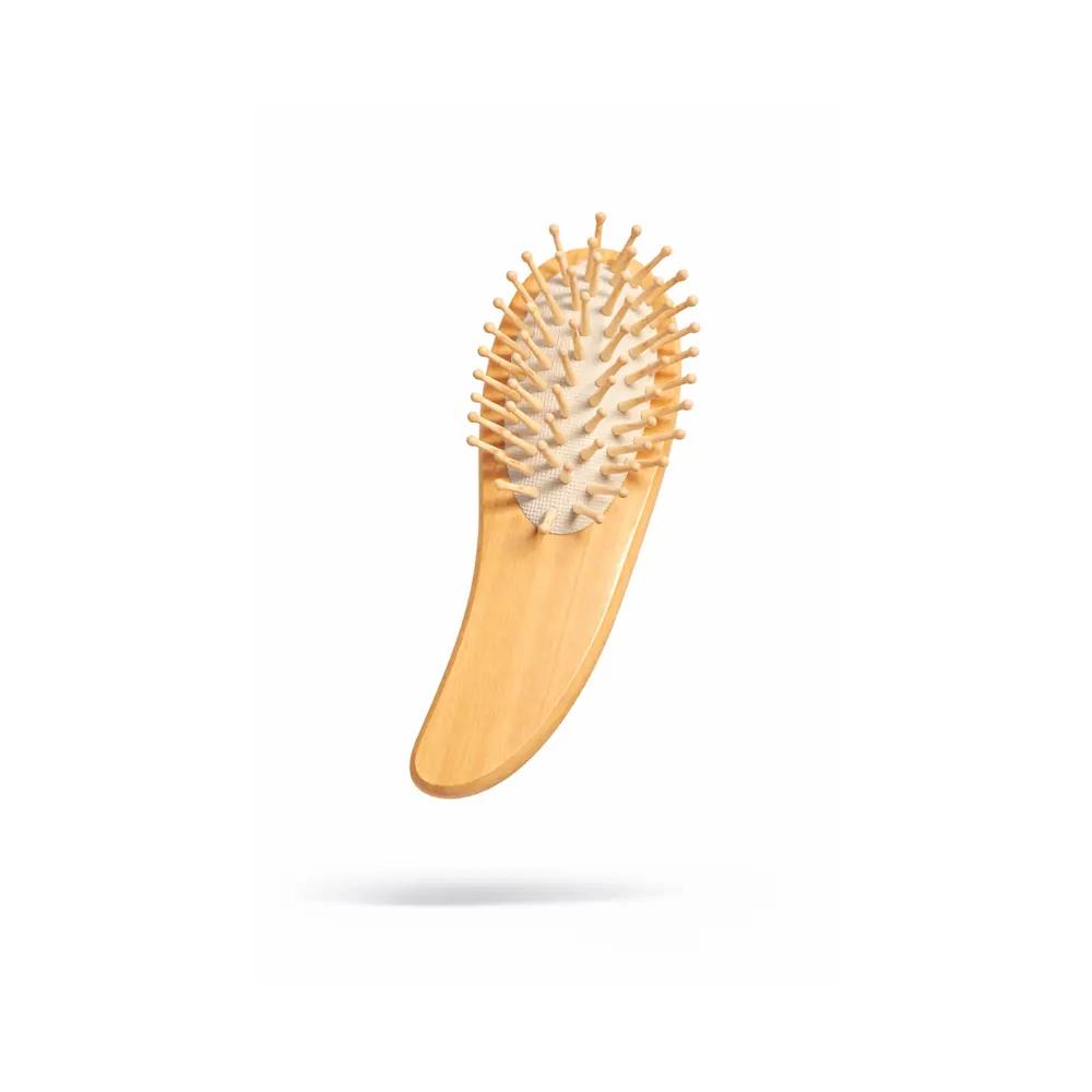 Denne hårbørsten i lyst naturtre er en praktisk og skånsom børste som passer perfekt til daglig hårpleie. Den kompakte størrelsen gjør den enkel å bruke både hjemme og på farten.