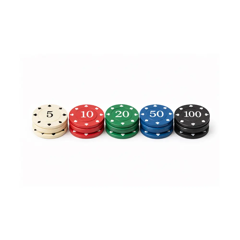 Settet inneholder 15 poker sjetonger, med 3 brikker av hver verdi (5, 10, 20, 50 og 100). Dette gjør dem perfekte til bruk i mindre spill eller som tillegg til et større pokersett.