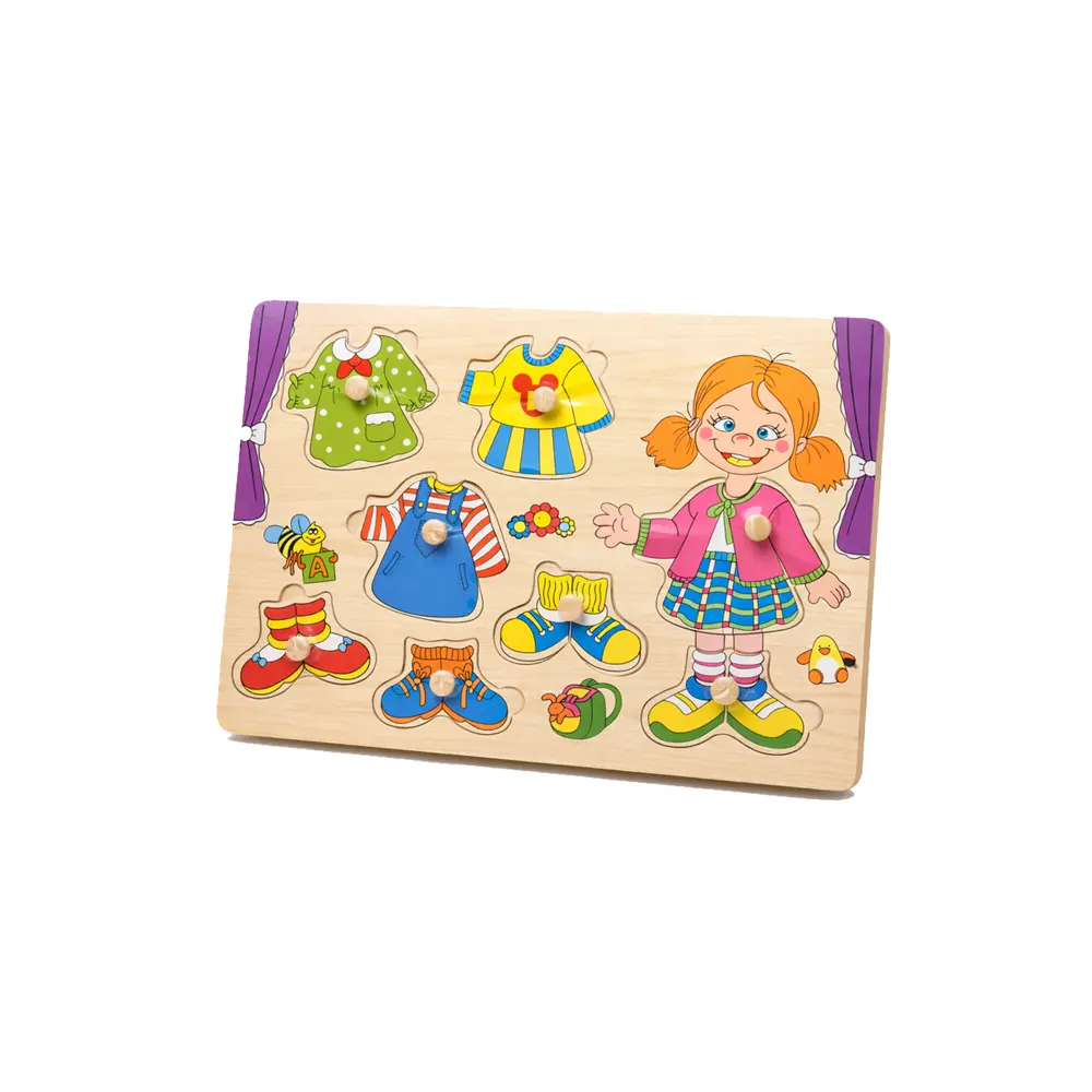 Dette puslespillet i tre for barn lar barnet kle på en jente med ulike overdeler, kjoler, sko og antrekk. Barnet kan mikse og matche klær og lage sine egne kombinasjoner, noe som styrker kreativitet og selvstendig lek.
