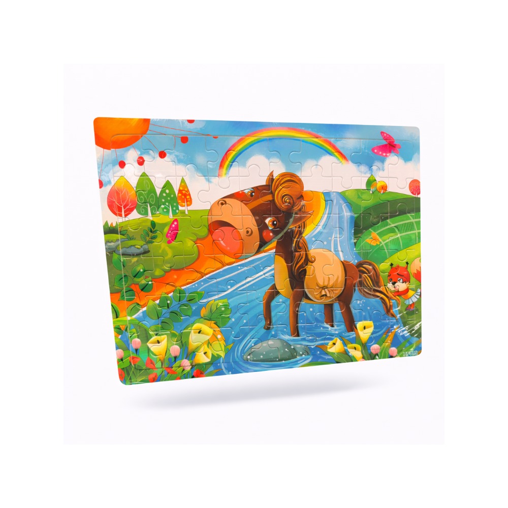 Fargerikt barnepuslespill med et glatt og glad motiv av hest i vannet, regnbue og natur. En koselig aktivitet som passer fint til barn som liker dyr.