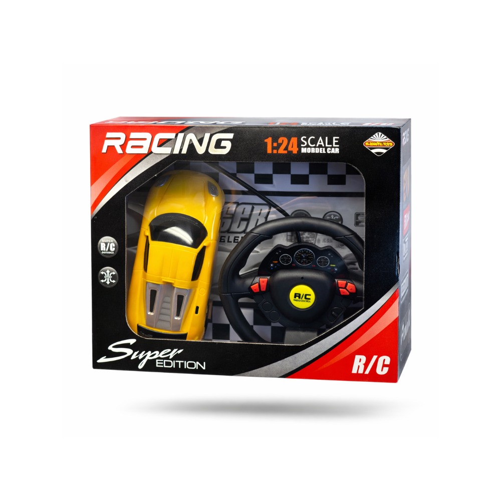4 Kanals Racing bil (1:24) er en tøff radiostyrt racerbil som gir masse moro hjemme på gulvet eller på glatte underlag. Den stilige, gule og røde sportsbil-designen gjør den ekstra kul å leke med, og med 4-kanals styring kan du manøvrere bilen fremover, bakover og svinge for å kjøre rundt hinder og svinger.