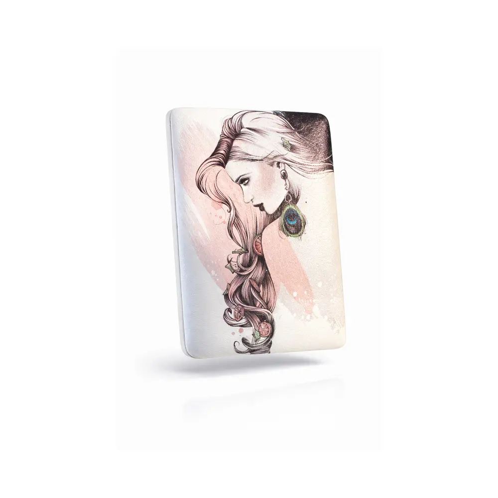 Dette dekorative lommespeilet med kunstnerisk kvinnemotiv kombinerer praktisk funksjon med et stilfullt og elegant design. Speilet har en illustrasjon av en kvinne med langt hår og dekorative detaljer som gir et sofistikert og moderne uttrykk.