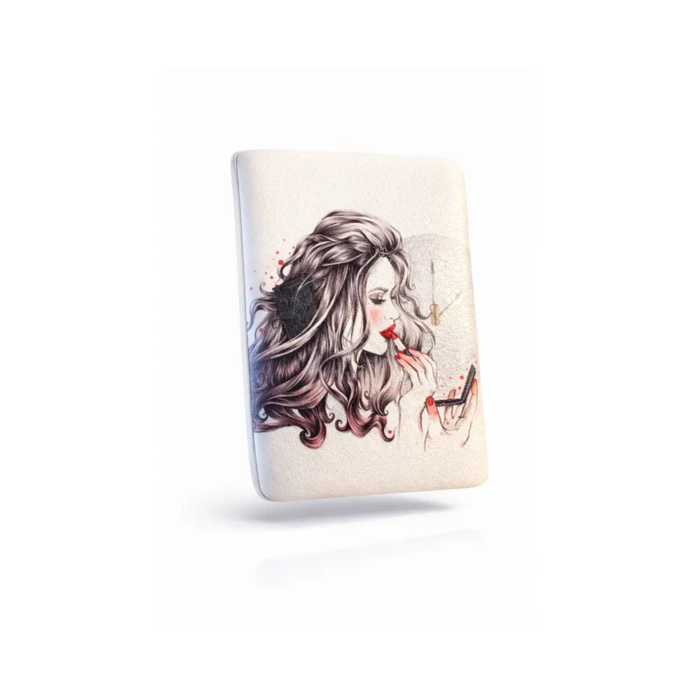 Dette dekorative lommespeilet med sminkemotiv kombinerer praktisk funksjon med et elegant og feminint design. Speilet er dekorert med en detaljert illustrasjon av en kvinne som legger leppestift, noe som gir et stilrent og moderne uttrykk som passer perfekt for sminkeinteresserte.