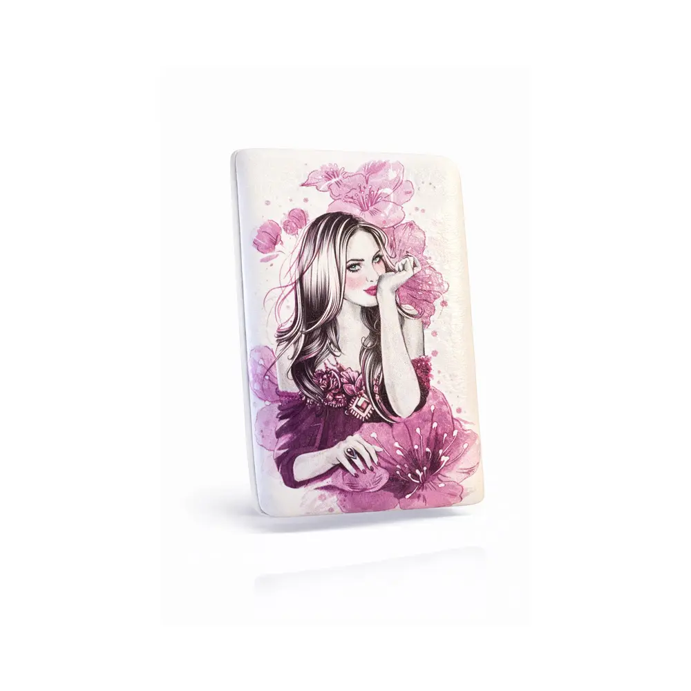 Dette dekorative lommespeilet med blomster- og kvinnemotiv kombinerer praktisk funksjon med et feminint og kunstnerisk design. Speilet er dekorert med en illustrasjon av en kvinne omgitt av rosa blomster som gir et romantisk og stilfullt uttrykk.