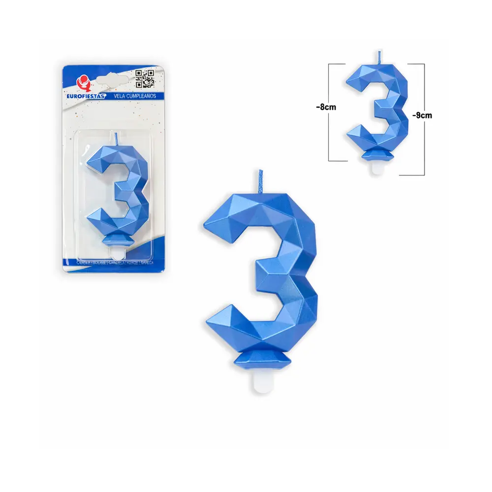 Gjør kaken ekstra dekorativ med dette blå tall-lyset nummer 3 i stilrent polygon-design. Den kantede formen gir et moderne og elegant uttrykk som passer like godt til barnebursdager som til større jubileer.