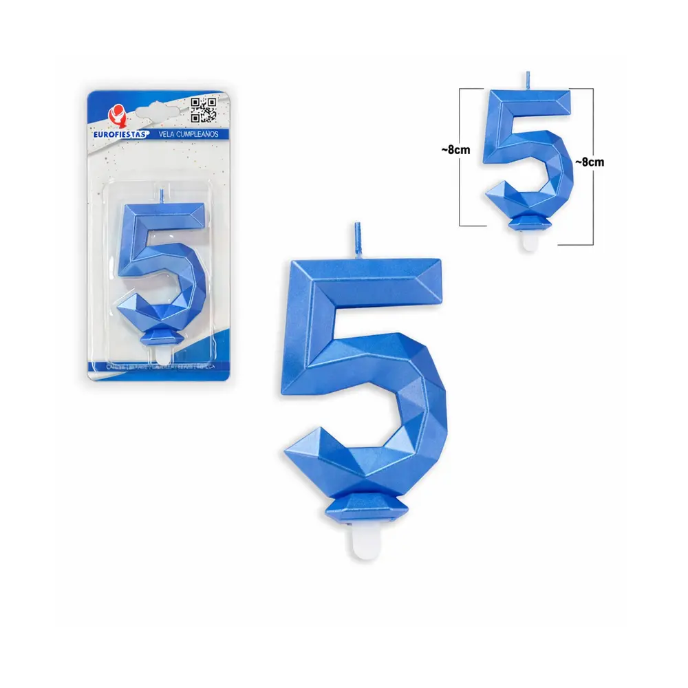 Skap en stilren og dekorativ kake med dette blå tall-lyset nummer 5 i moderne polygon-design. Den kantede og elegante formen gir et trendy uttrykk som passer både til barnebursdager, voksenfeiringer og jubileer.