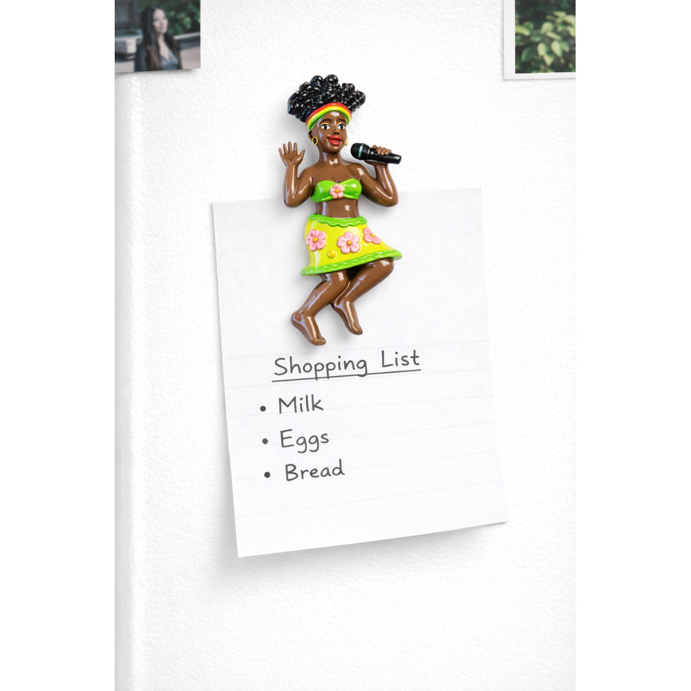 Dekorativ kjøleskapsmagnet designet som en livlig, tropisk sanger med mikrofon i hånden og fargerikt antrekk med blomsterdetaljer. Den dynamiske posituren og de sterke fargene gir et energisk og iøynefallende uttrykk. Perfekt for å pynte opp kjøleskapet eller magnettavlen med en unik og dekorativ detalj.