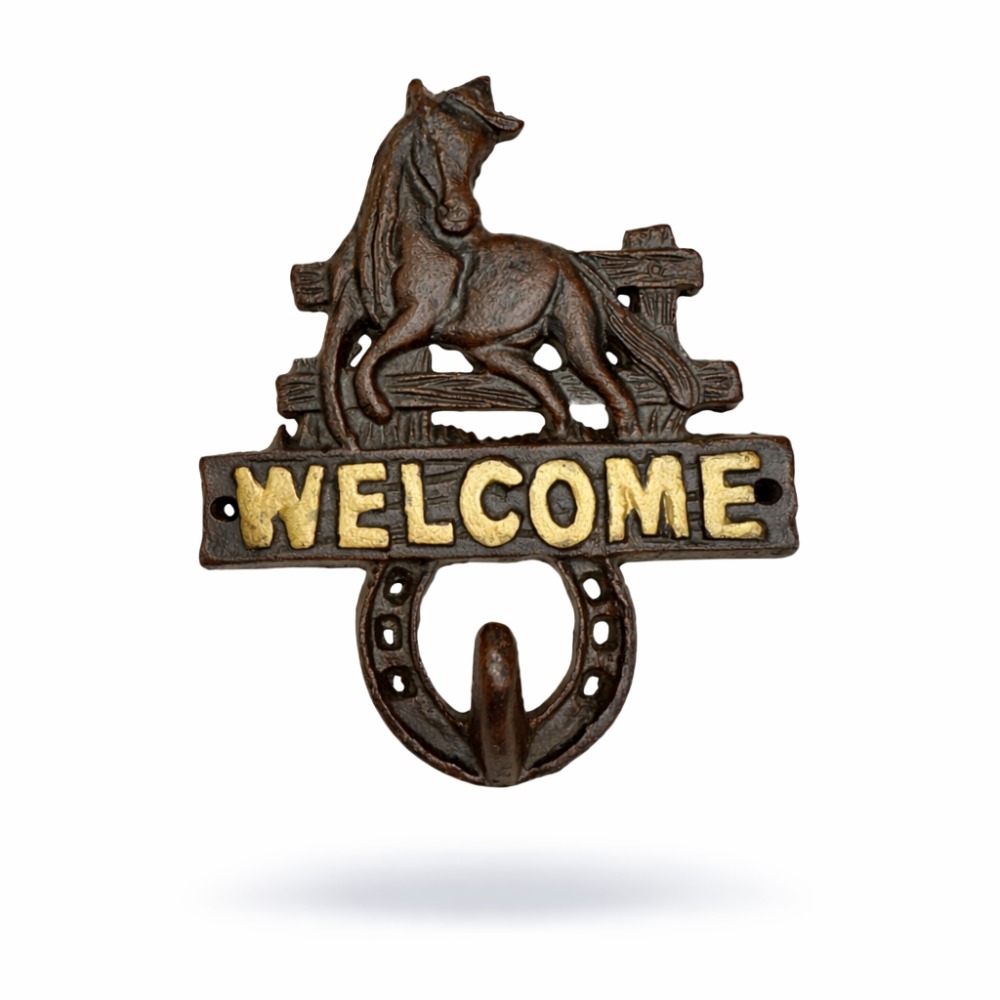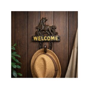 Rustikk veggkrok i støpejern med hestemotiv og “WELCOME”-tekst. Perfekt til oppheng av jakker, nøkler, bånd eller småting – en stilig detalj til gang, hytte eller stallmiljø.