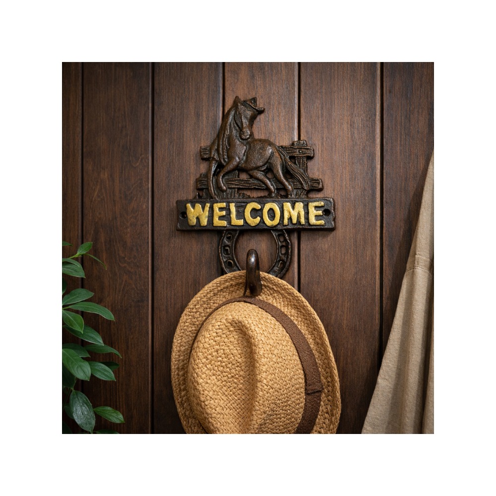 Gi inngangspartiet et varmt og landlig preg med denne dekorative WELCOME-veggkroken i støpejern. Designet kombinerer en flott hestefigur, en klassisk hestesko og en solid krok som passer perfekt til alt fra jakker og hatter til nøkler, hundebånd eller små vesker.